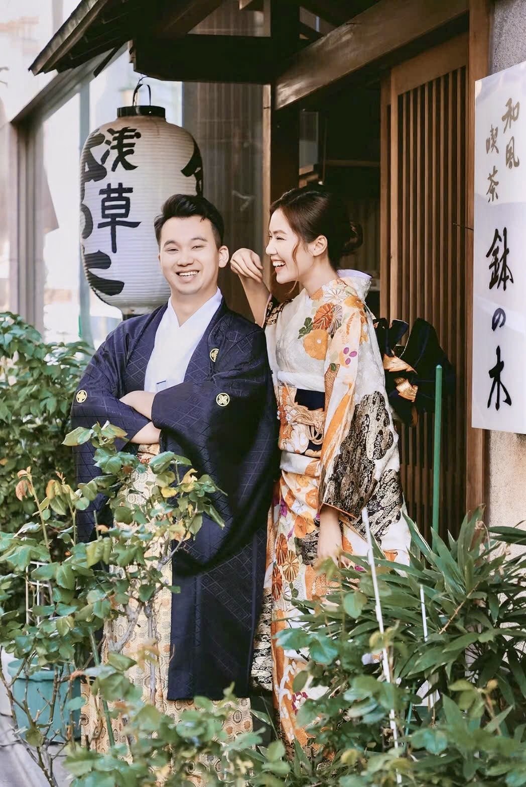 Another popular style is to let the woman’s kimono stand out with soft, pastel colors, while the man wears basic colors: