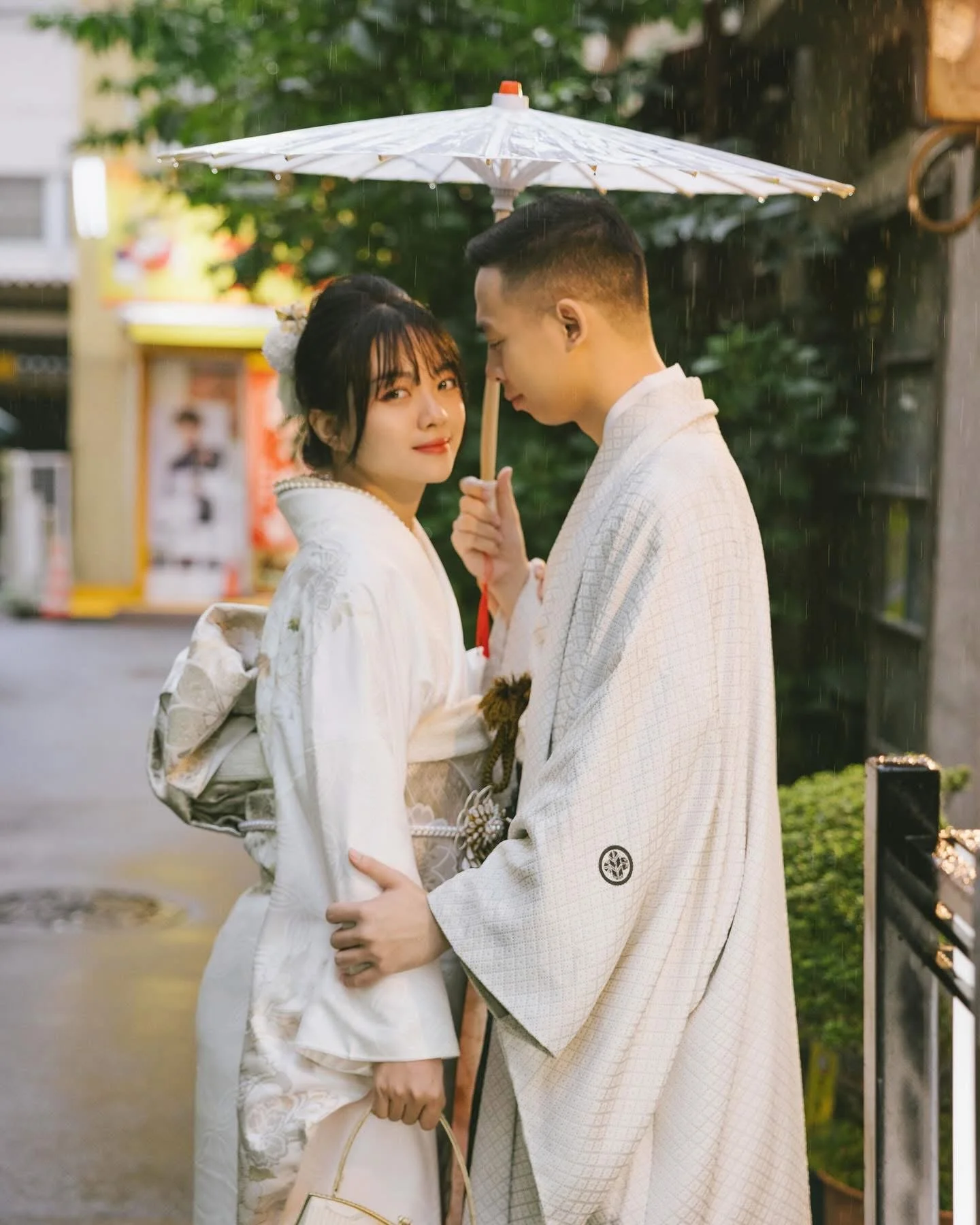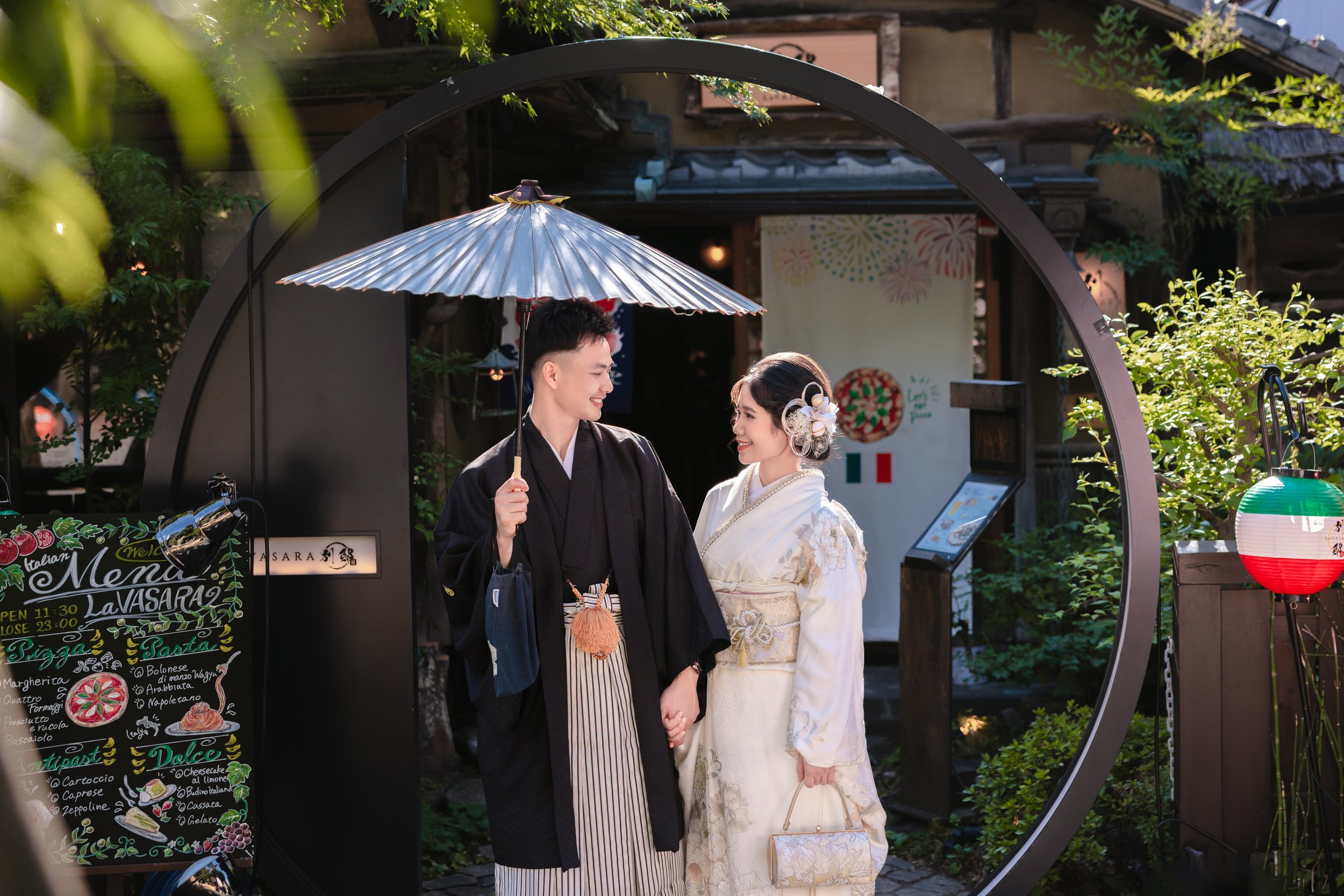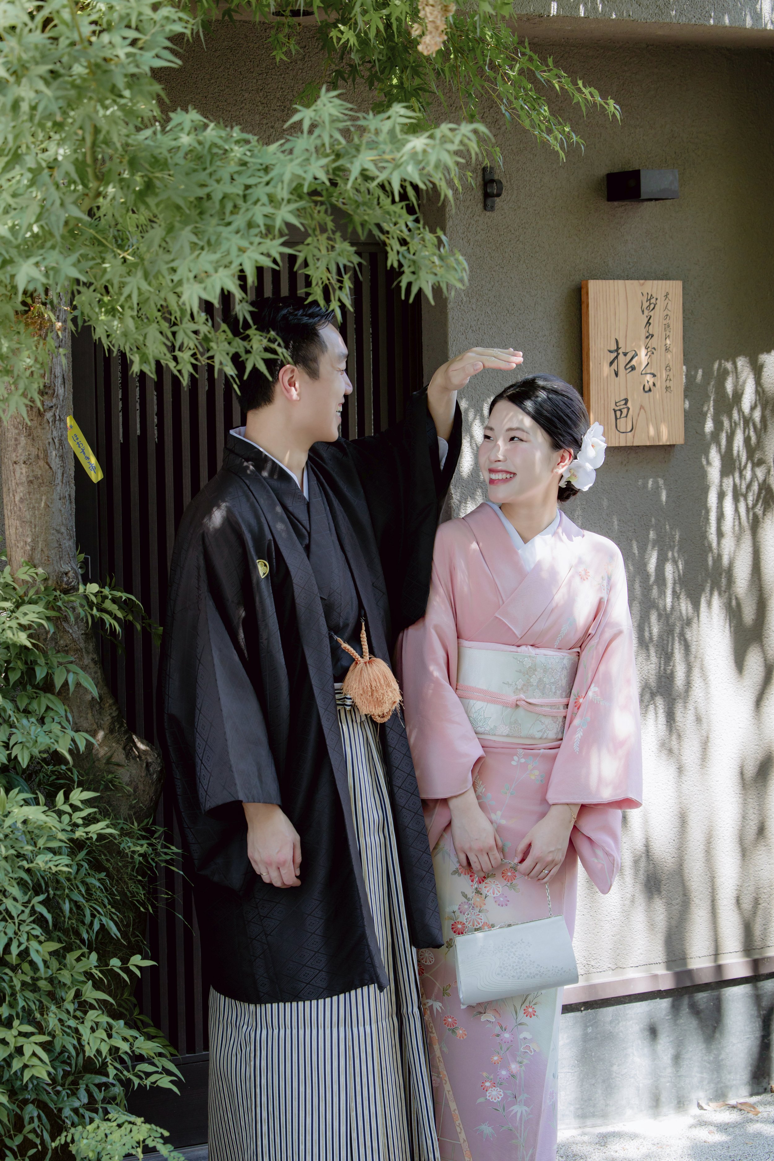 Another popular style is to let the woman’s kimono stand out with soft, pastel colors, while the man wears basic colors:
